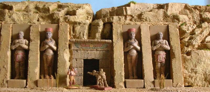 Made this about 5 years ago, recently put a smaller doorway in and gave it a repaint. The statues are removable, so that they can be used with other bits and pieces.The rockface is made from casts from Woodland Scenics rock molds. Statues are from Monolith and the entrance is from Grendel. Apologies for the quality of the picture, it's a bit out of focus.