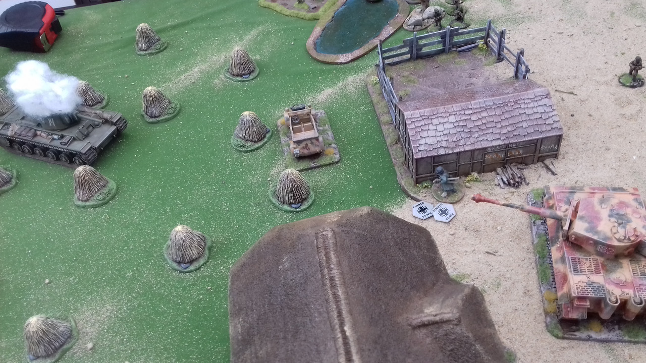 The crew, clearly fresh out of tank school, it seems couldn’t hit a barn at 30 yards!  They certainly couldn’t hit a partially obscured stationary staff car!  When the Tiger did eventually come into view, the one shot the Russian managed to get on target proved useless against the thick German plating.  Very soon after that, it was itself knocked out by the Tiger’s 88.   The crew baled  out....but let me assure you, they were taken to the rear after the action subsided, and , well let’s just say, they won’t be missing any more targets.