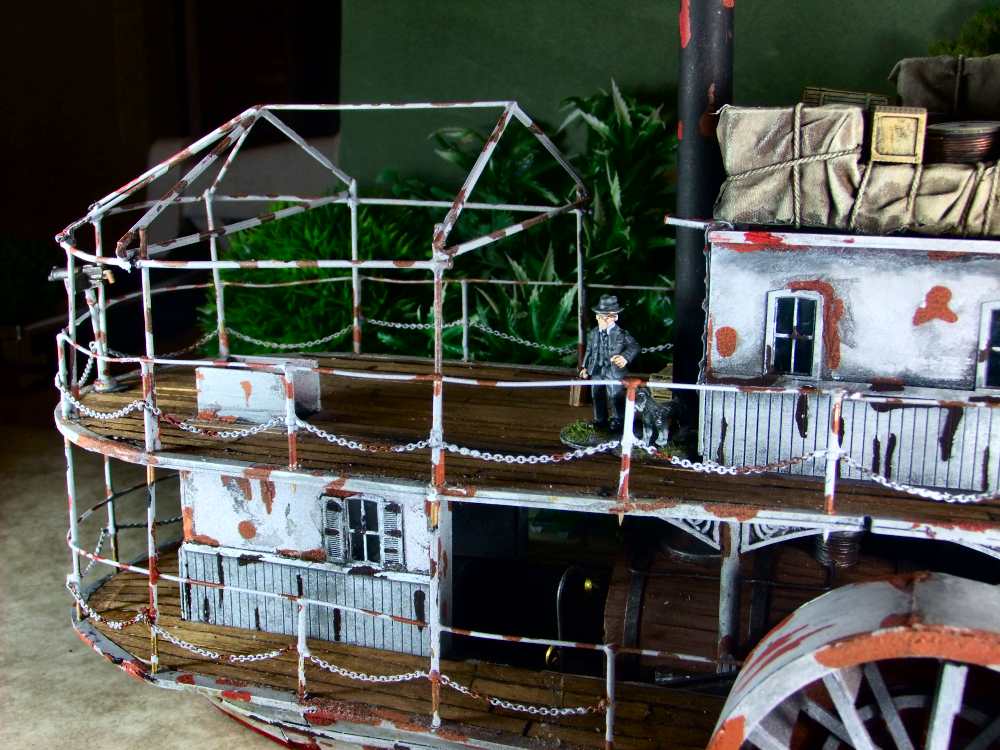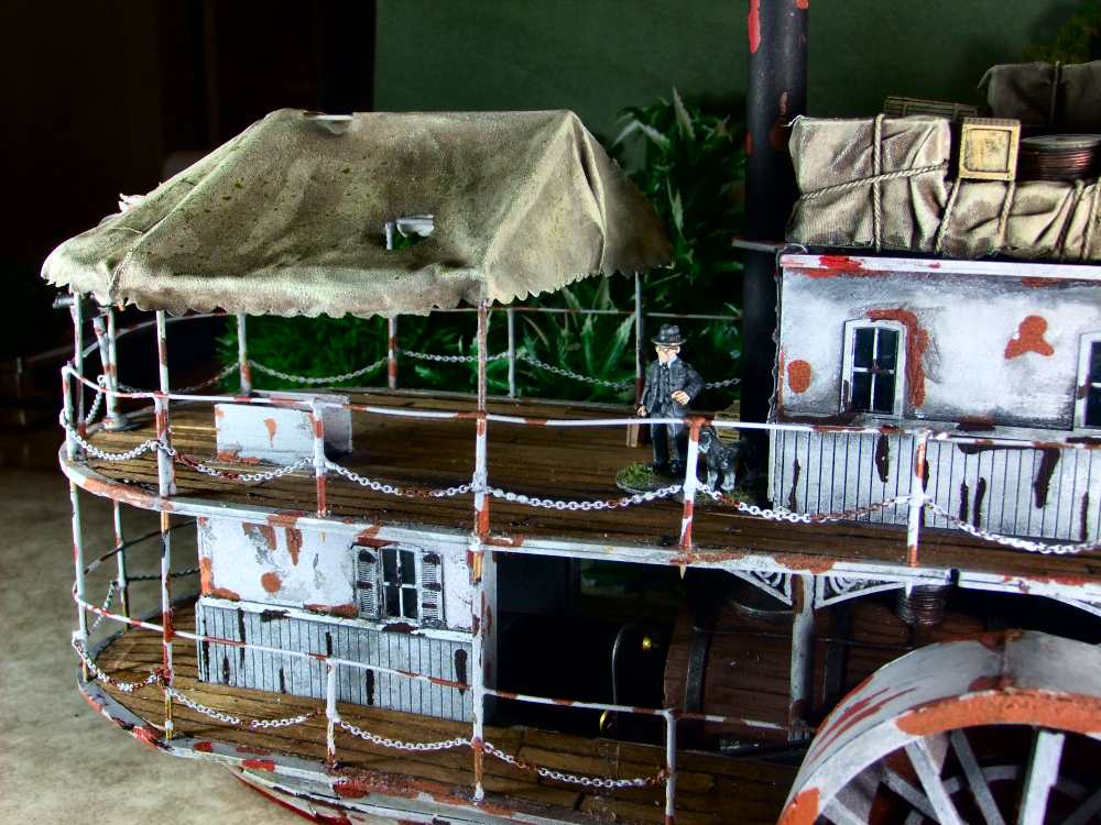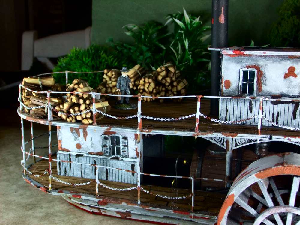 I made the canopy because 'it looks right' but I realized from the start that it is not very practical from a gaming standpoint. It is therefore removable. Here I have loaded the deck with bundles of wood for the boiler. They will work as cover in a fire fight to.