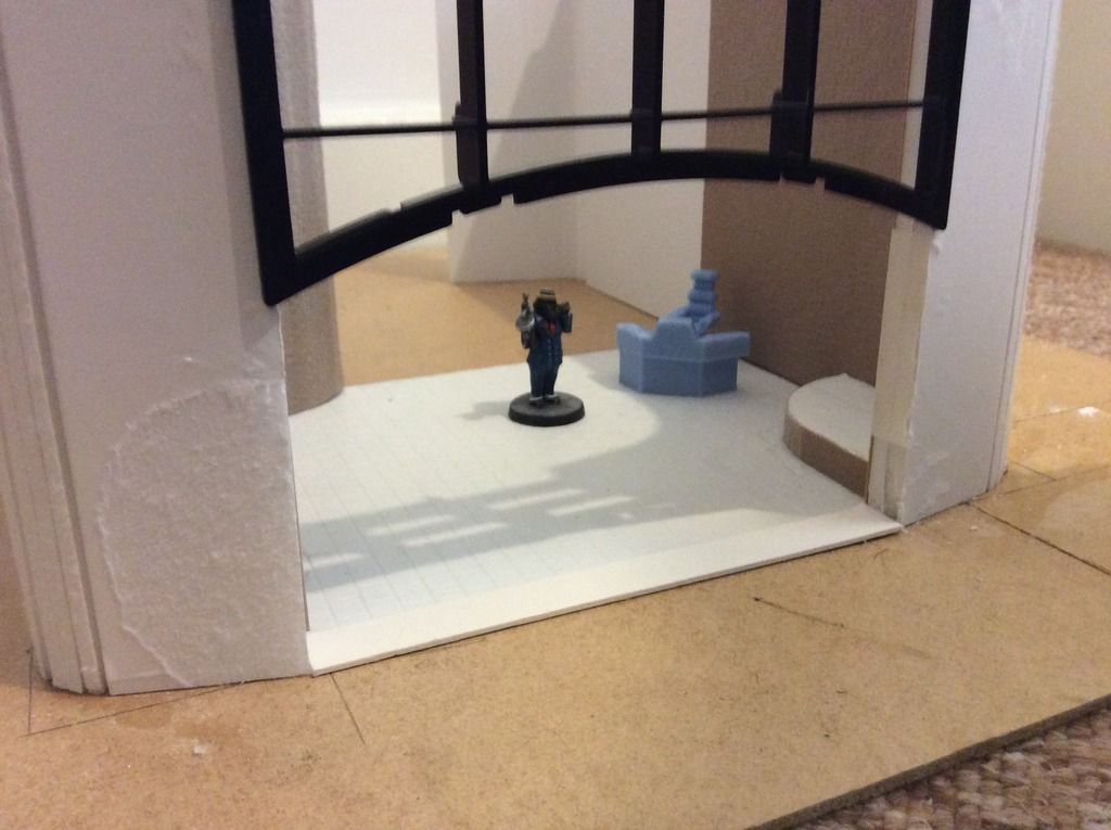 The inside reception with eventually have a back dividing wall cutting across from the lift entrance(the cylindrical shape in the middle) My is to have a security reception in there and some potted plants/trees in the corners.