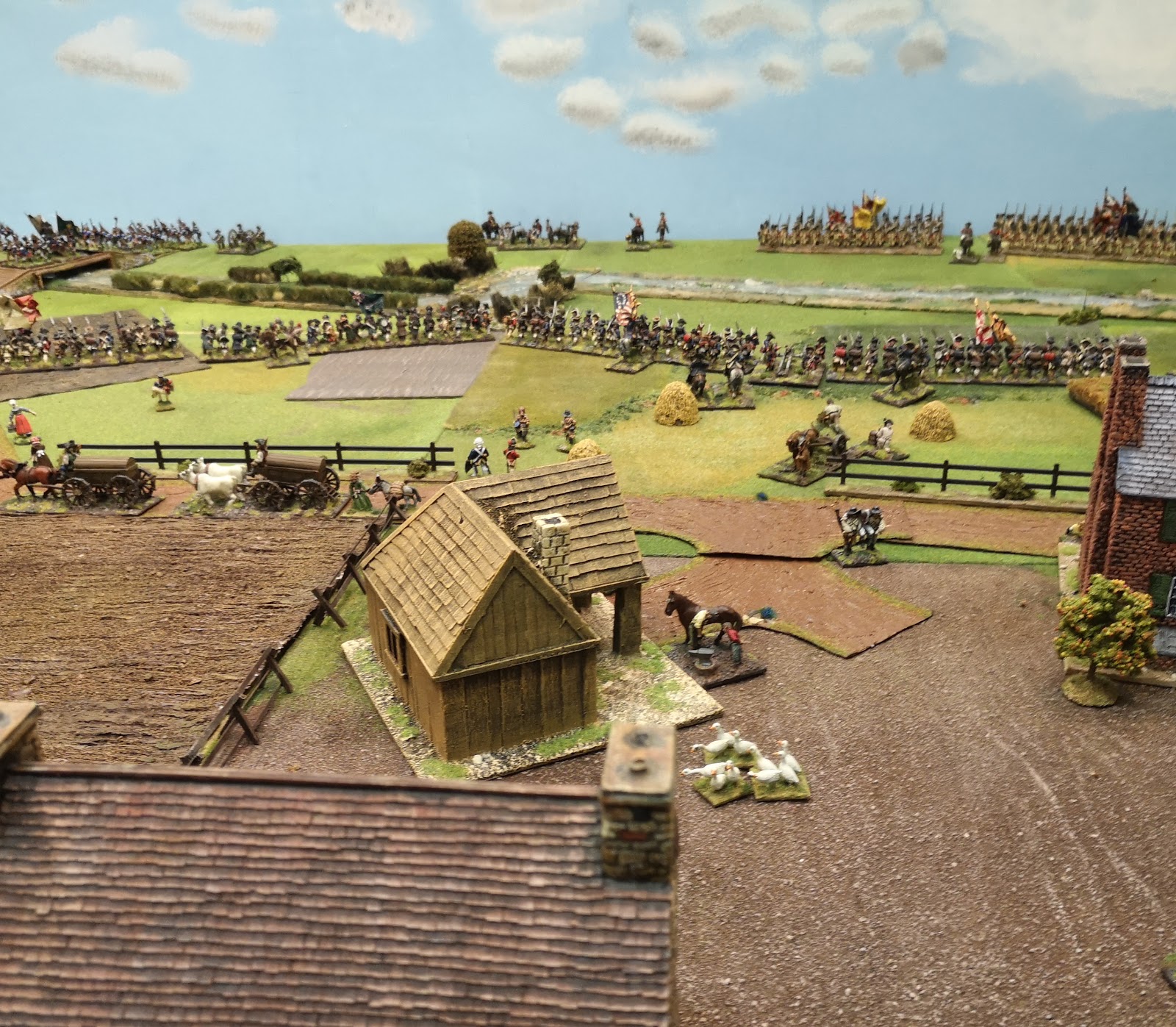 Looks like a good game - and I like that it was hypothetical.  We AWI enthusiasts tend to be too well versed in the historical battles to be surprised.  Many nice touches - the geese, the horseshoers at work, the wagons with draft horses and oxen, the pack horse led by a lass.  The club album showed somebody being hung from a tree - was that actually in this game?  One request, can we get an Order of Battle for both sides of the game?  You list the crown forces but not the patriotic forces. (guess which way I lean  lol)  Is that a pig pen in the background of the first photo, beyond the large field across from the wagons?
