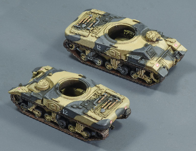 Turns out they weren't. There were some Sherman III conversions and defrocked Priests, but the Ram Kangaroo didn't come along until mid-late 1944, so they should just be painted in overall SCC 15 Olive Drab. Which I would have known if I'd done even a little bit of research before I charged in with my paintbrush  lol