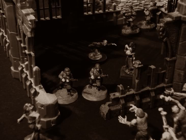 Through the flickering glare of gutted and burning buildings both sides could see the shambling gait of hundreds of nightmare corpses reanimated to unlife.