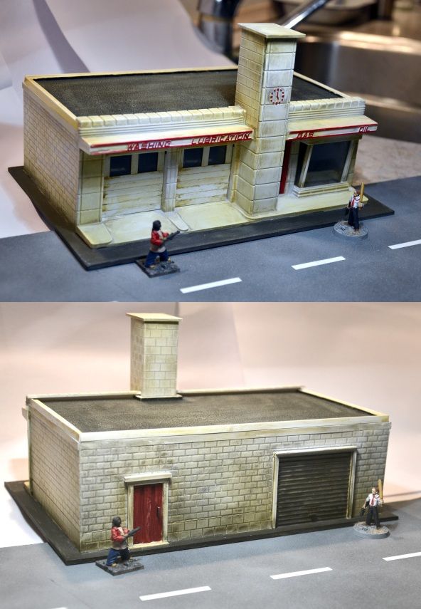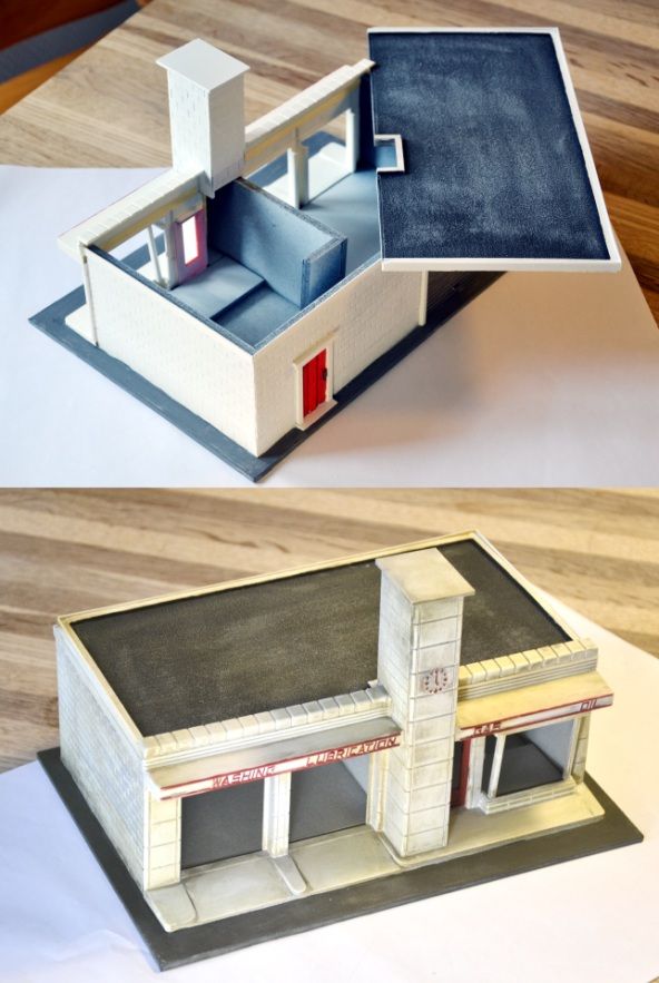 Model is base coated, window and door details are added and whole model is weathered with weathering spray from Model Mates