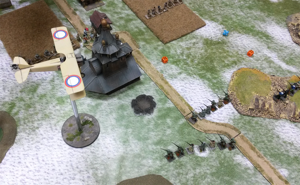 SPAD VII fighter strikes from above and wreaks havoc upon red conscripts, killing some and frightening much more with his only bomb! This timely arrival gives defenders time to reorganise.