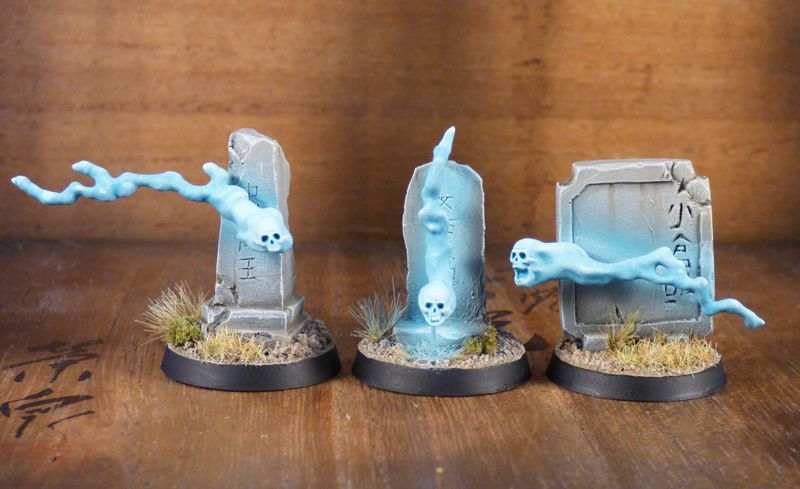 thanks guys :-)Here are a trio of Hitodama for use in the same games. Hitodama are the visible souls of humans which have detached from their host's bodies, they are completely harmless yokai that illuminate graveyards at night... unless of course you've misidentified them and you're actually dealing with a trio of onibi, who are a type of blue vampiric demon fire that drains the life energy from anyone who strays too close. I guess you'll just have to guess which ones they are and take a chance.the models themselves are made from some Plascraft Japanese gravestones and some flaming skulls from a Games Workshop undead kit, no conversions here, but I'm pleased with the glow they give off- almost too bright to look at under the right conditions :-)
