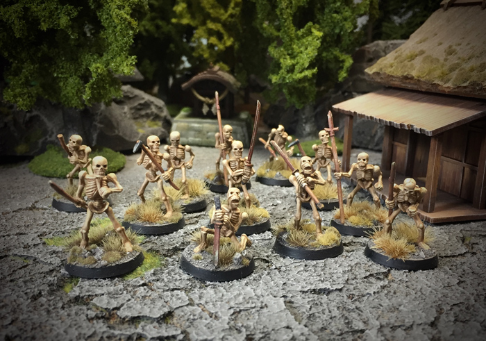 The base is old Citadel plastic skeletons (I found at the bottom of some storage box), modified with a few weapons (mostly Perry) and a few different skulls.
