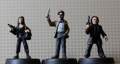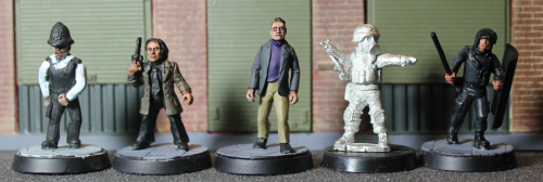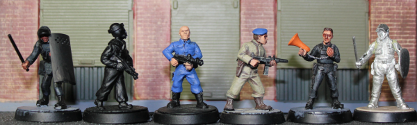 Offensive Miniatures Riot Police; CP Miniatures SF trooper; Crooked Dice Armed Minion with automaton head); Copplestone Guard in Beret; Offensive Miniatures Riot Police Sergeant and Hasslefree Neil (with Offensive Minitures baton arm).