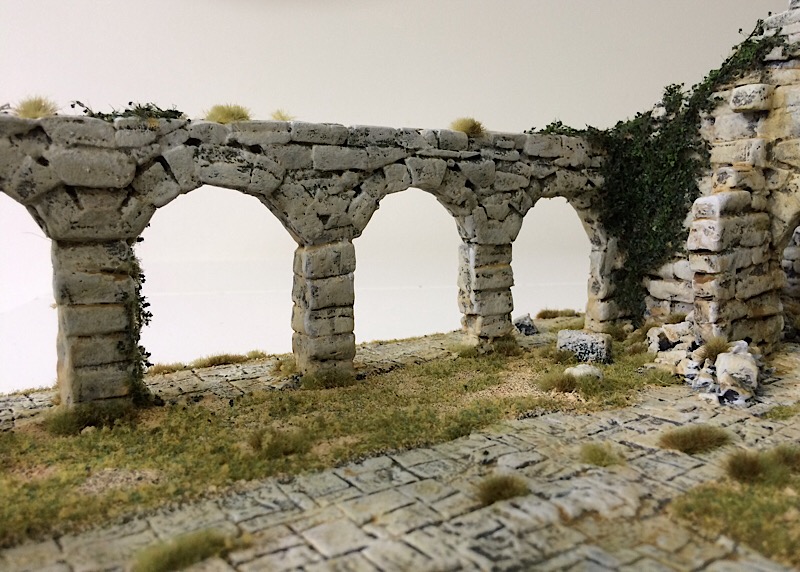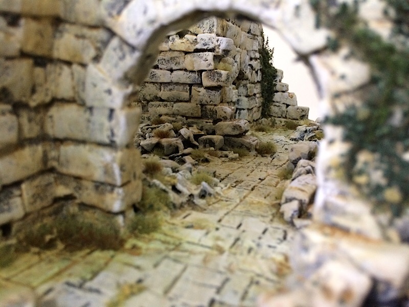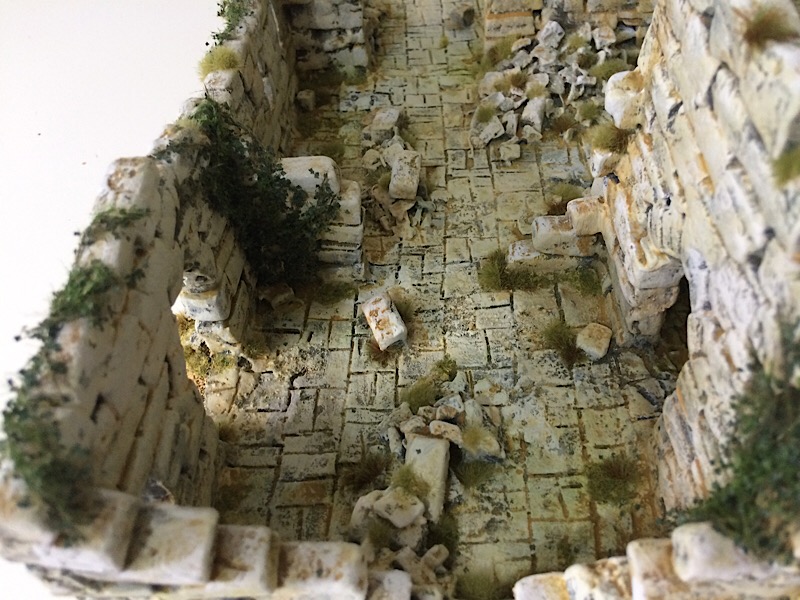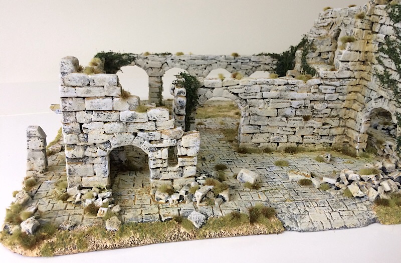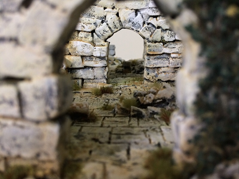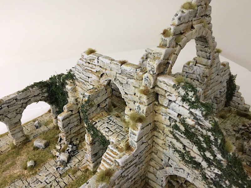 With painting completed the vegetation was added, starting with the ivy, which was tacked in place with UHU clear glue. The upper leaves were drybrushed with VMC Olive Green.