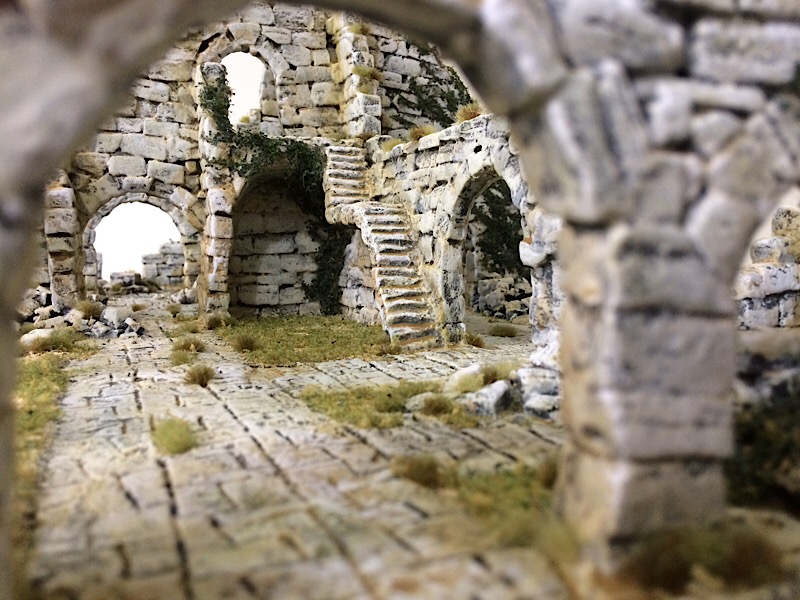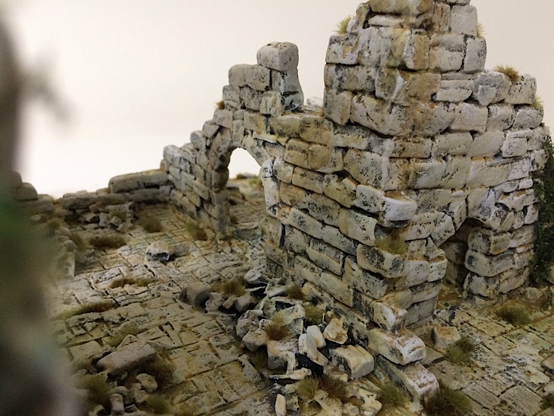 Atop and within the walls and rubble piles I added small straw-coloured  tufts (Mordheim Turf by Citadel). I then added, including to the ground, an ad hoc mix of 6mm tufts by Gamers Grass, using Light Green and Mixed Green, from both the Small and the Wild packs. The flock that followed  is a mix of 4 pinches of Javis Static Grass No.2 Summer Mix 2mm (JHG2) to 1 pinch of Woodland Scenics Coarse Grass Burnt Grass (T62) and 1 pinch of Woodland Scenics Coarse Grass Yellow Grass (T61), with excess brushed away after drying.