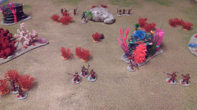 • Swimmers (i.e. Merrow for this game) could cross any troops or terrain (except the kelp forest) without penalty. They could also fire over friendly walkers.