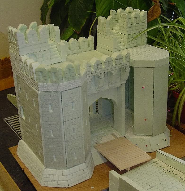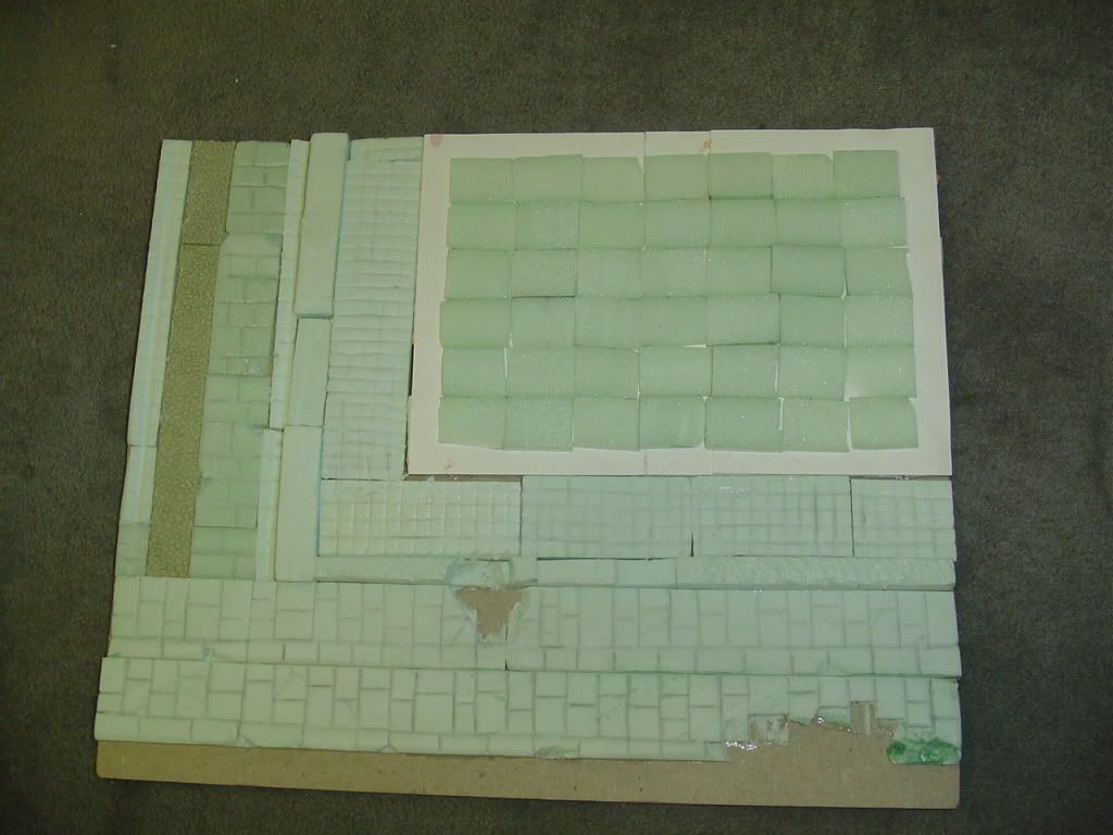 To create the impression of height in low relief steps with a slight backwards slant are used. Every scrap of foam left over from other building projects can be used in this way...