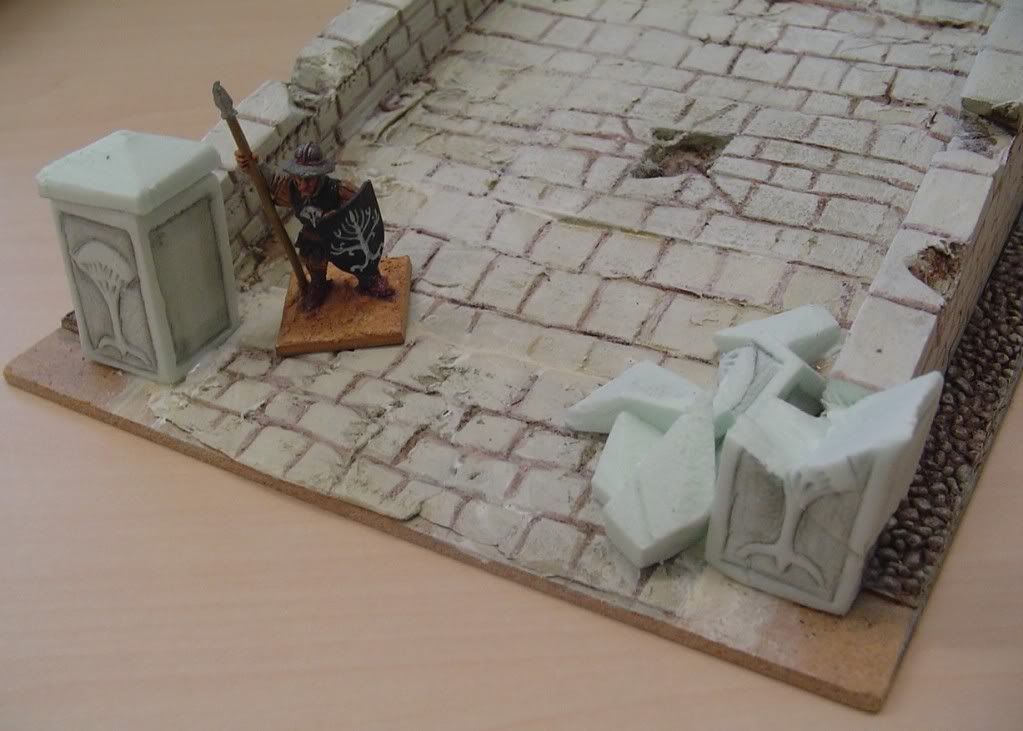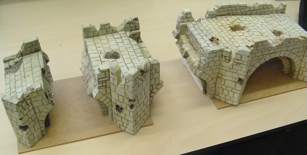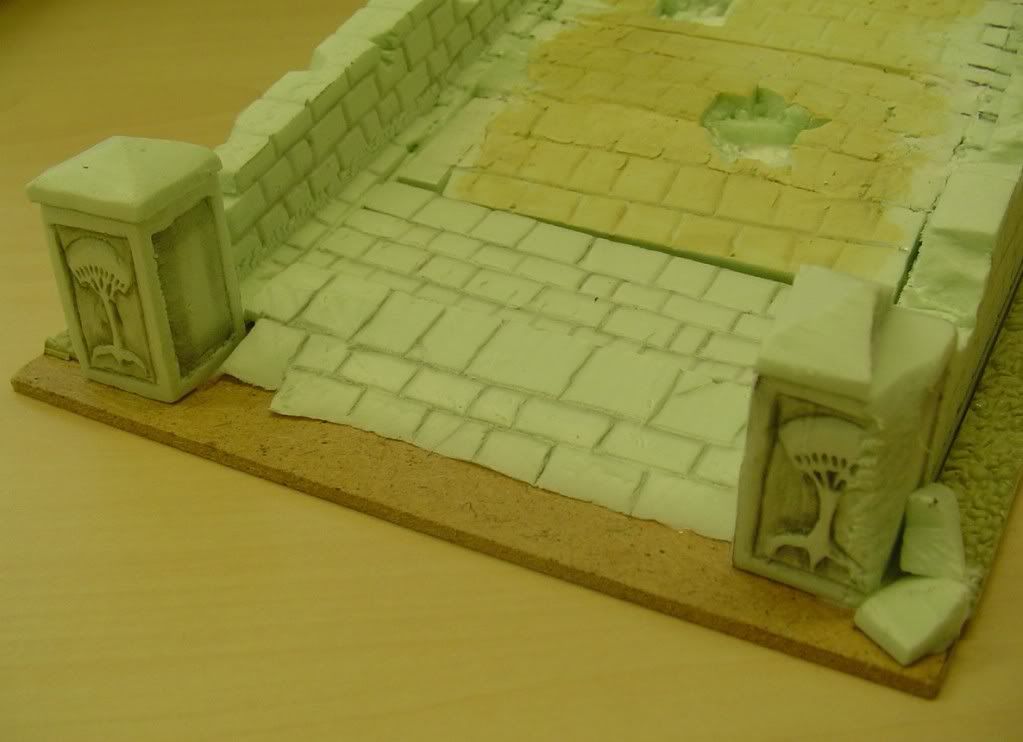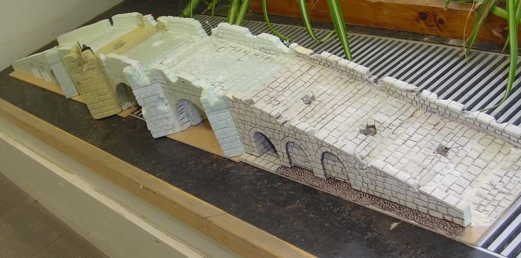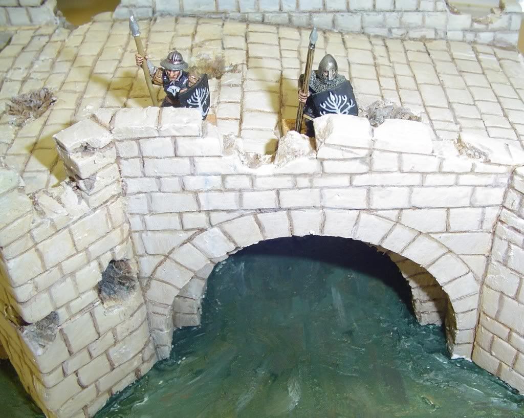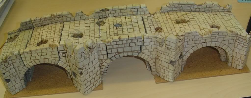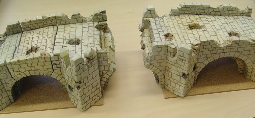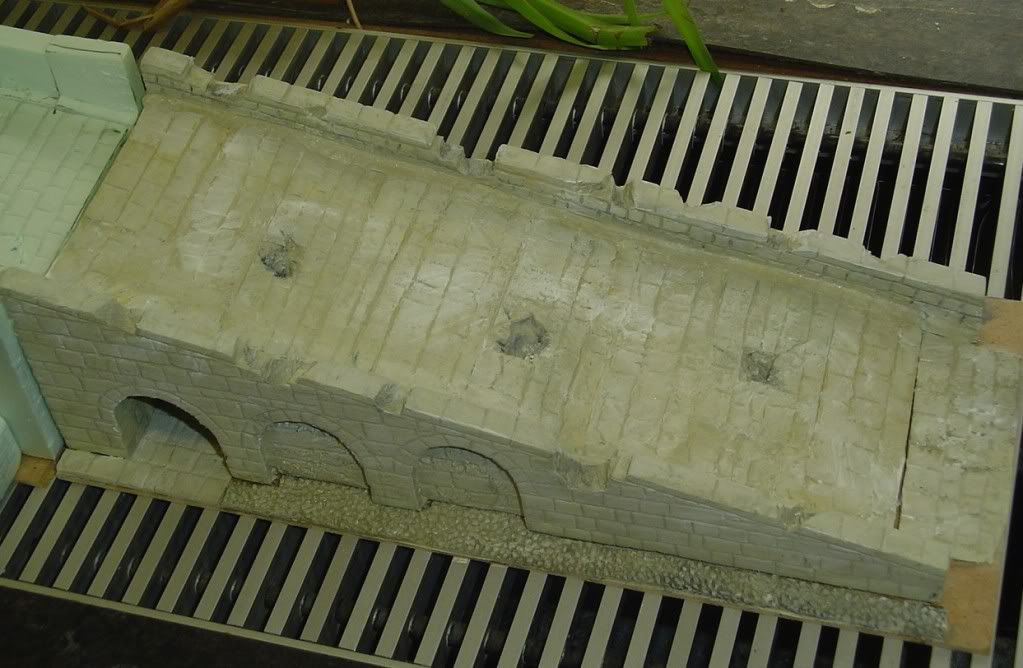 Flanking the bridge will be baseboards with flooring, steps, ruins etc. in low relief onto which rubble and ruined buildings can be placed.