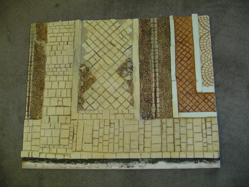 One base which has reached the undercoat stage with alleyways, drains, floors etc. using a number of different surfaces from flagstones, cobbles, and tiles in different patterns and arrangements.