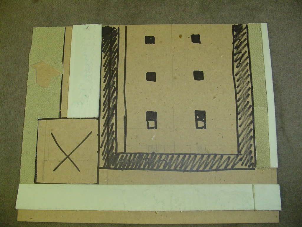 Each baseboard starts life as a simple concept - in this case an aisled building with a bell tower - the footprint for a future ruin model is mapped out and the surrounding ground laid out