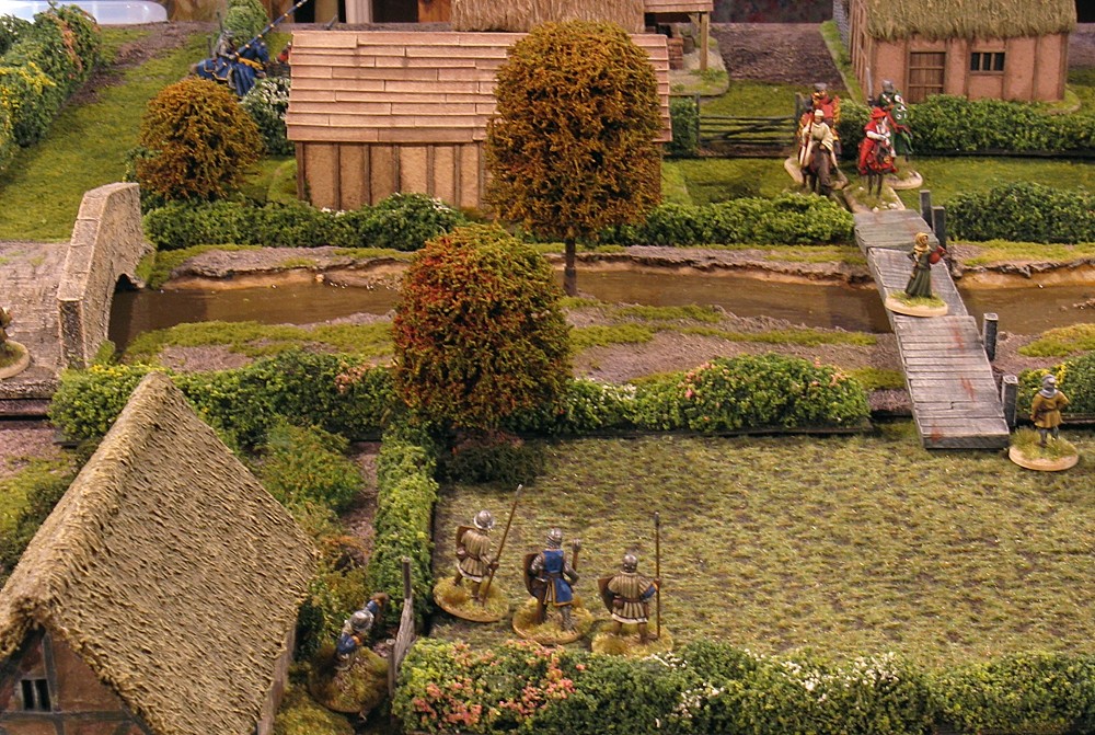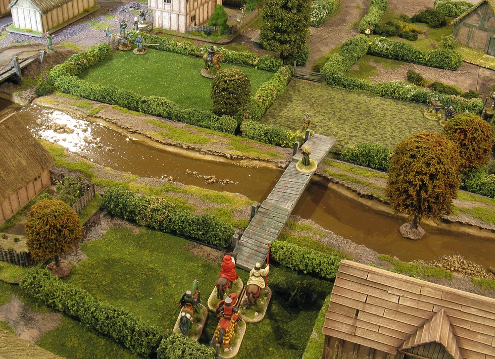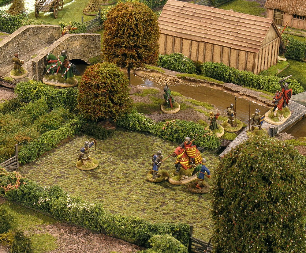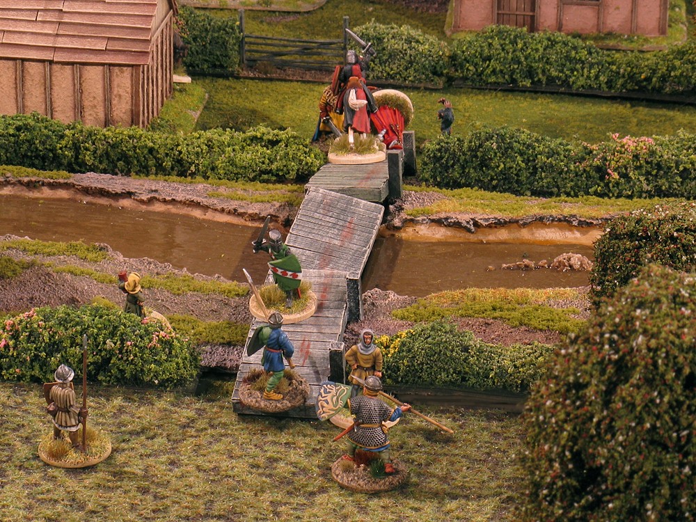 Sending Guiseppe off  to see if Sir Roger needs either assistance, absolution or spiritual comfort, Cardinal Grigorio now pauses by the footbridge on the Cumwhinton side, sending his two remaining knights forward across the Trickle to deal with Fidler’s men, and the newly appeared Sir Guy de Mordant…