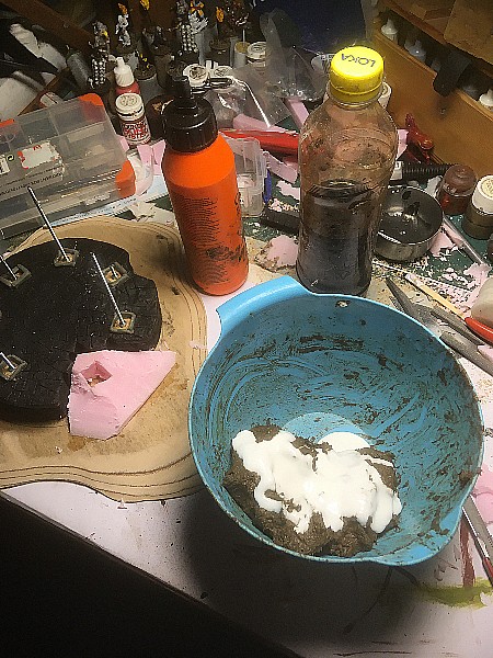 I have shown before (link) how I do dirt ground on game boards. The consistency of the mache is important as too much water in the mix makes it shrink like a bastard. You all know the feel of a fresh piece of dog mess when toy with it in your hand? That's the consistency we're looking  for!  Add a good dollop of white glue to the mix for increased adhesiveness and durability.