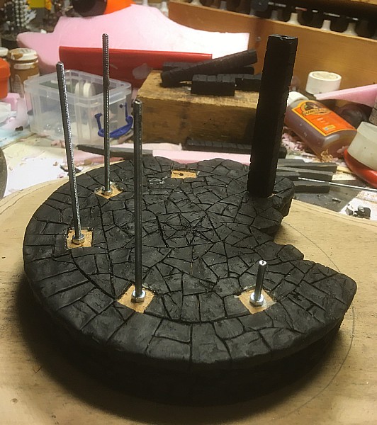 The platform was affixed to the base board as previously. I screw/bolt in place quite often these days as it allows you to take complex builds apart should you have made a mistake. I had previously sculpted a sort of plinth for each pillar to be fitted in as it did not look quite right having  them stand directly on  the paved platform.