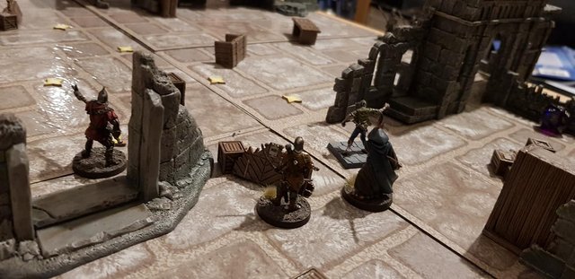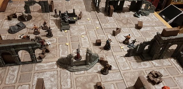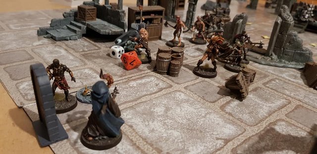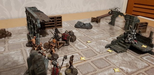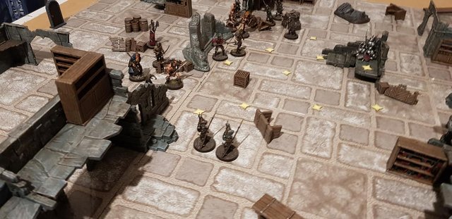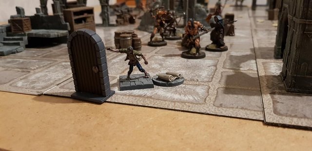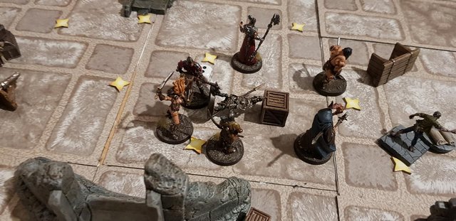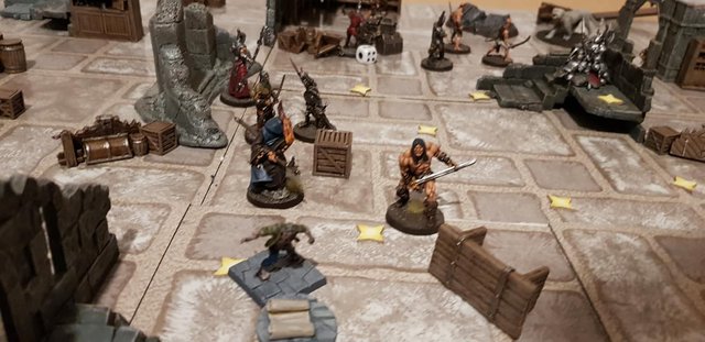Free of danger for now, the warband investigate the markers. The Barbarian grabs a magic weapon, the zombie grabs a treasure which later turns out to be gold and a +2 damage magic hand weapon while the archer finds an unpleasant surprise one a Skelton.