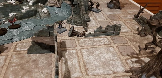 The warbands zombie is ordered to hold the line now the vampire is out of the game, and kills three skeletons one after another.