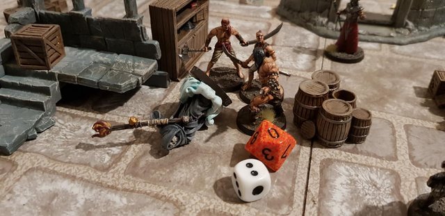 Finally killing the snow leopard the crossbowman and thugs head home. With his new magic weapon in hand, the Barbarian charges into the wraith but is finds himself suffering for it.