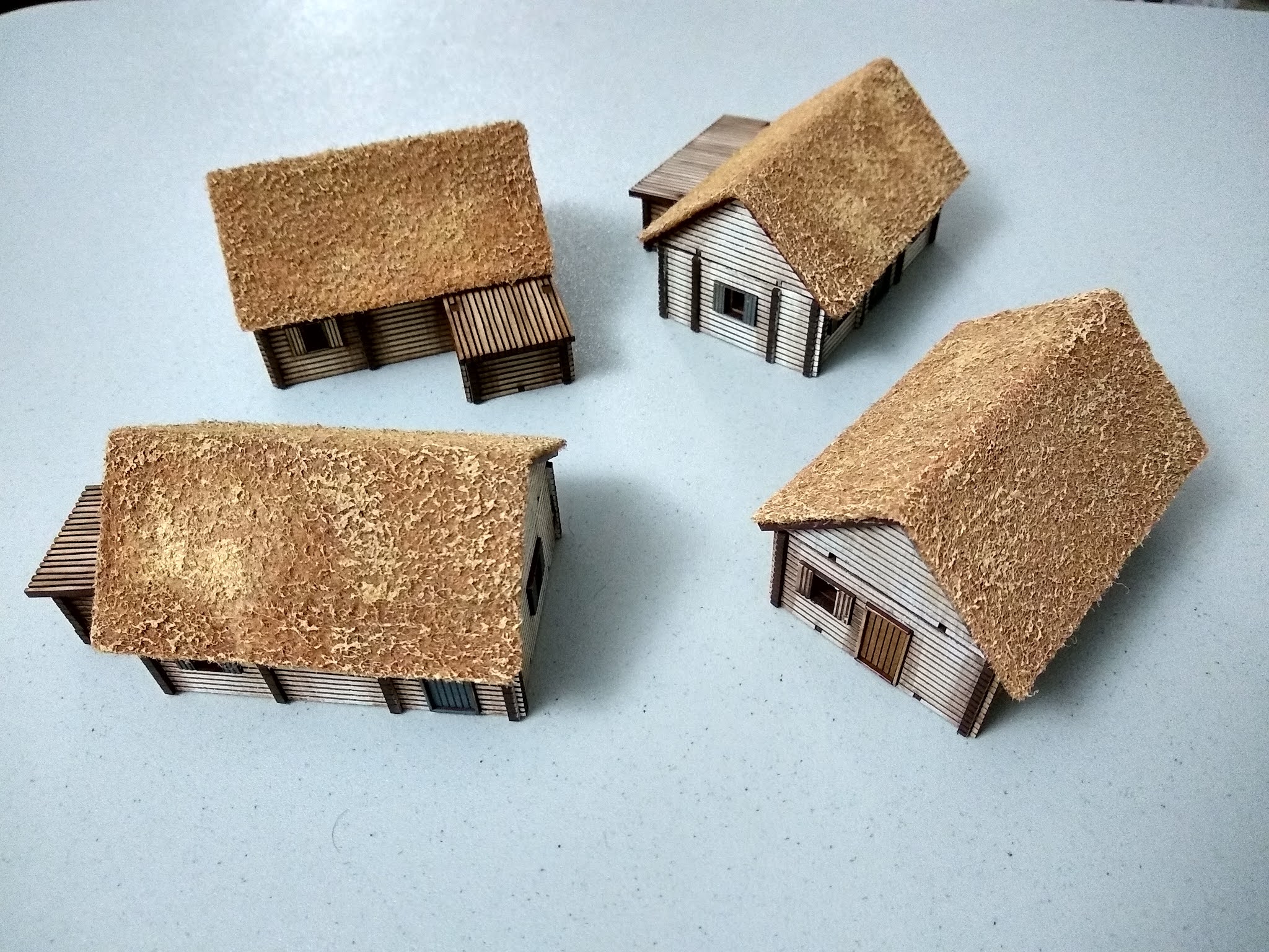 A handful of 4Ground cabins assembled, some painted - and ghetto thatch roofs added