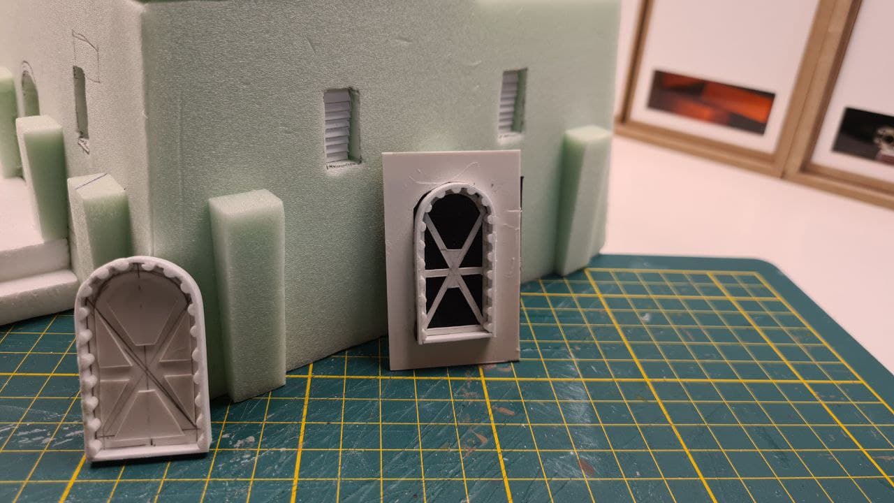 First up were the doors and windows. Yes, windows; I cut several window slits high up in the walls, right below the (envisioned) ceiling, because I felt that the otherwise rather bland side and back walls required a bit more visual interest. But leaving them open would not be an option. I mean; they would let in all the outside heat, plus the sand (Course; gets everywhere) and probably a multitude of creepy crawlers, most of which no doubt parasitic.