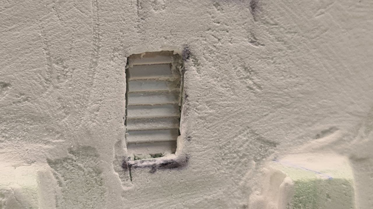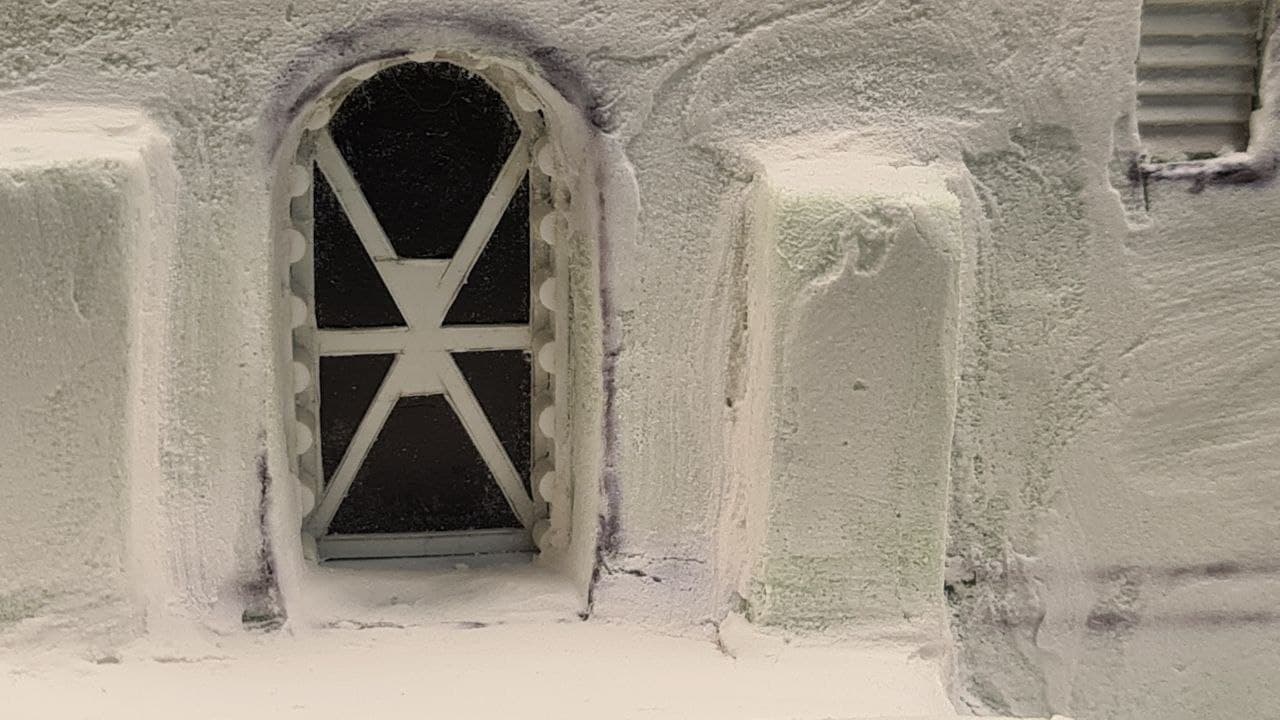 Once this was done, I covered the entire building in wall filler and let that dry completely. Once dry, I then sanded it smooth as well as I could, taking care not to take too much off so as to expose the foam underneath.