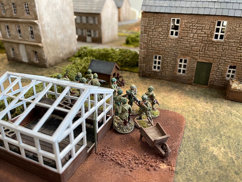 He then gets a section, .50 cal and senior leader deployed midway down the left hand edge as you see the table……aggressively pushing on the church…..safe in the knowledge his pre-game barrage will stop me effectively deploying enough to blunt him.