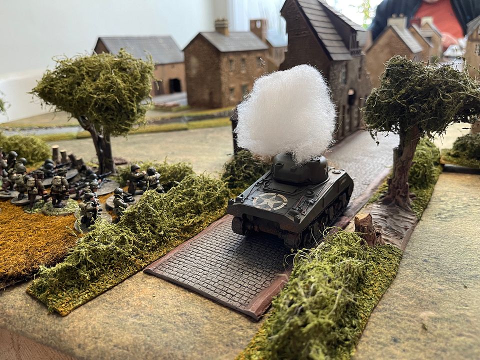 Anyway, announcing its arrival, the Tiger with one shot, knocks out the Sherman…..first blood and a point off the American morale.