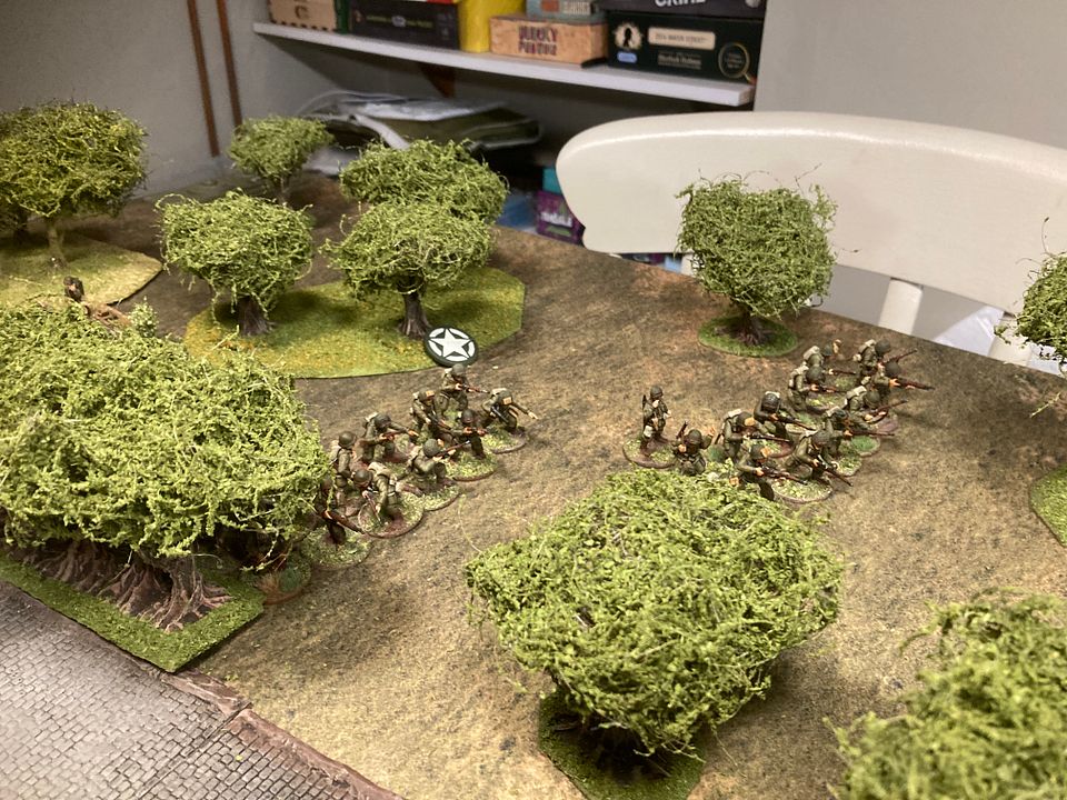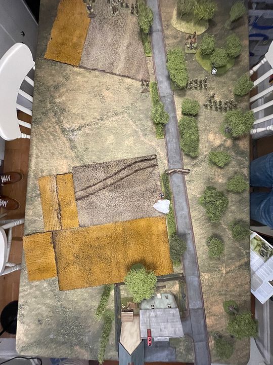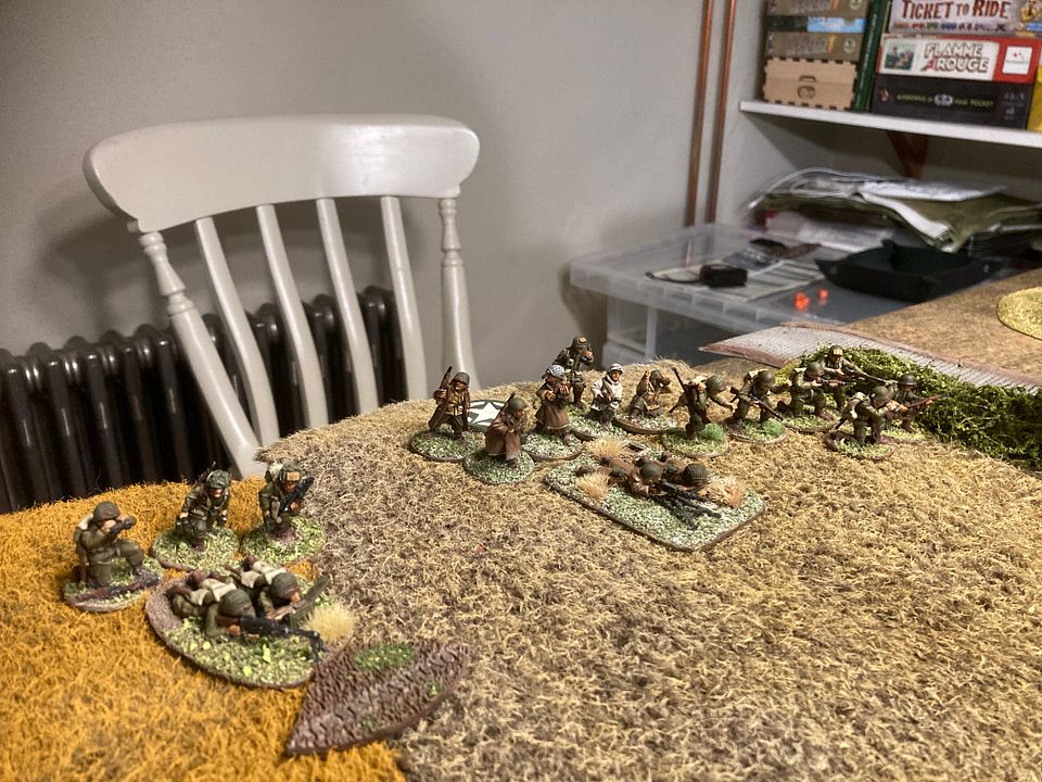 Jamie brought on the sizeable chunk of his force whilst I decided to hold back and make him come towards me. However, I made a very fatal mistake in thinking I needed to push my jump off points up table into the woods. In reality, what I did was expose them to a nicely concocted marching barrage of 81mm mortar fire that saw me paralysed pretty much as soon as it started. He managed to accumulate a CoC dice before me so I couldn’t end it and losing about a dozen chaps, withdrew to lick wounds and hope to hold him on the next map.