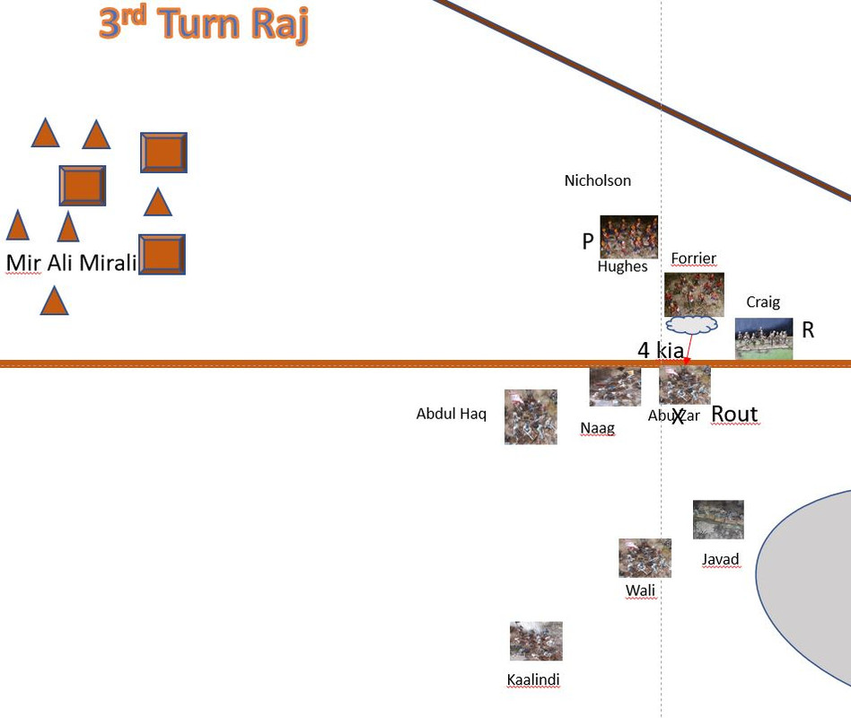 But the surprises are just begun: Wali kills 2 other Gordon but with an outstanding double 6 they do not pin again, ignoring hapless Craig hysterical commands. Hughes siks still pinned are attacked by Abdul Haq’s fierce warriors and routes. Same destiny for Forrier’s Bombay grenadiers, while Javad’cavalry decides to not charging the rallied Gordons.