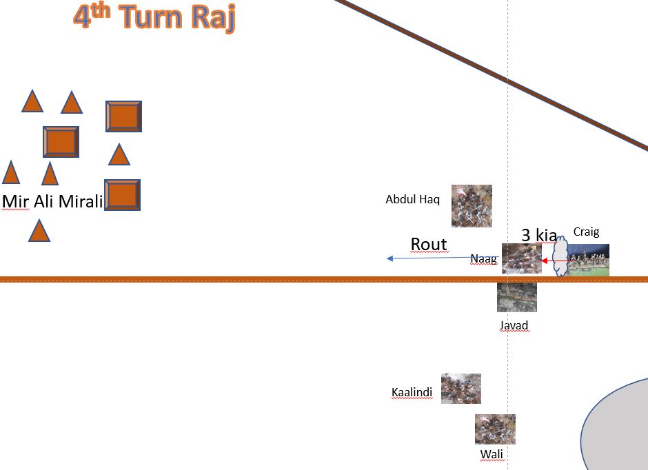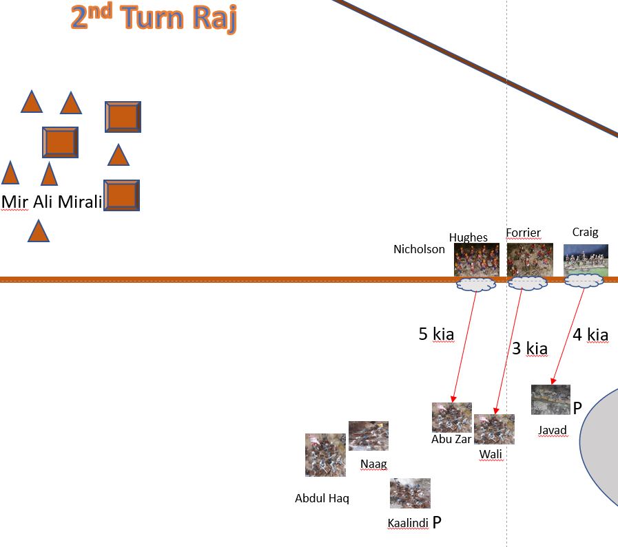 Naag khan attacks and wins against Ludhiana Sikhs and Abu Zar does the same against Bombay Grenadier even if with less men and they cannot rally in the following turn. Wali Khan succeeds in pinning Craig’s highlanders which then rally.