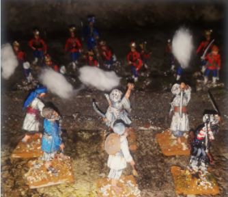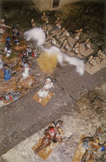 Forrier’s grenadiers win the test and not pin and release a devasting volley: 7 5/6 out of 8 dice! Abu Zar should die but use his lucky for a re roll who hits 4 men, but one of this is him (double 1)!!! Destiny is destiny! Kismet is kismet! While he dies his tribesmen run away and the tide changes again.