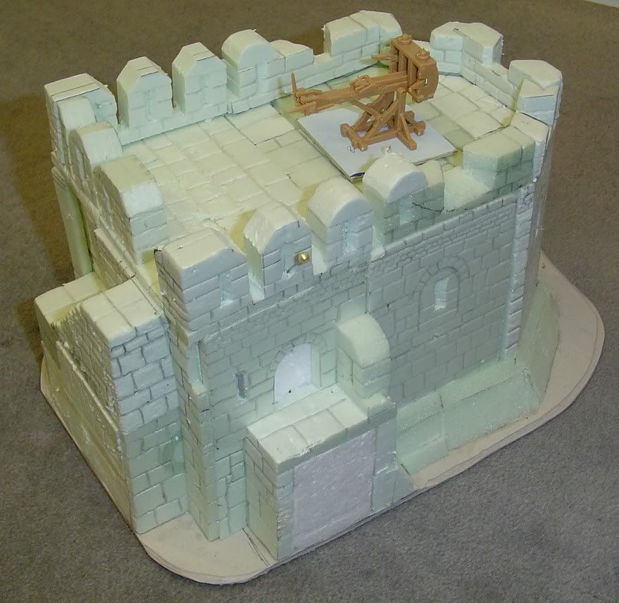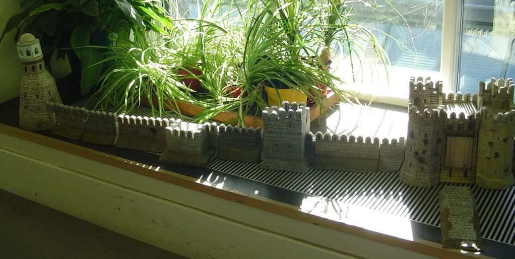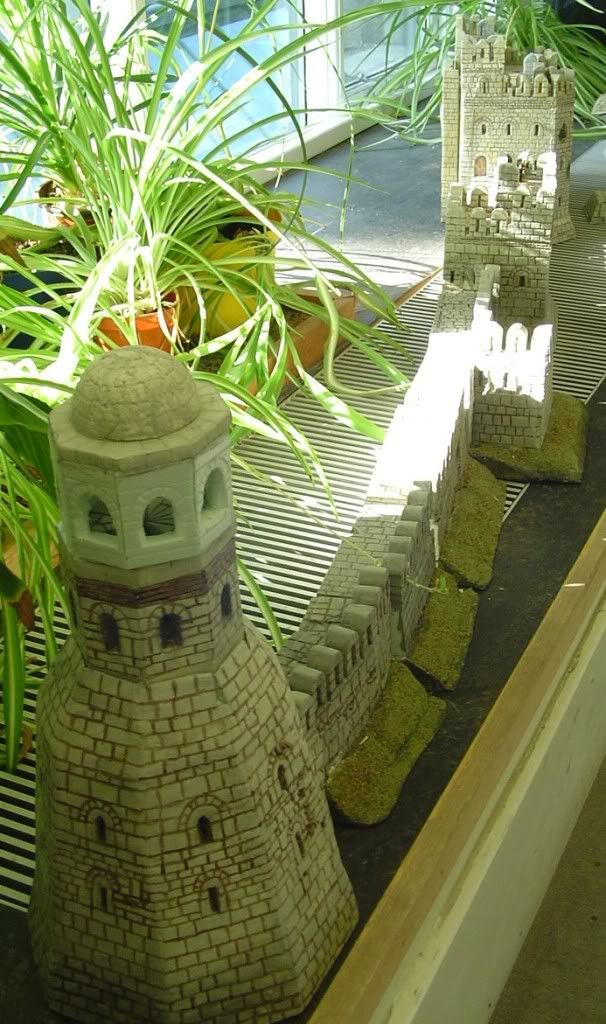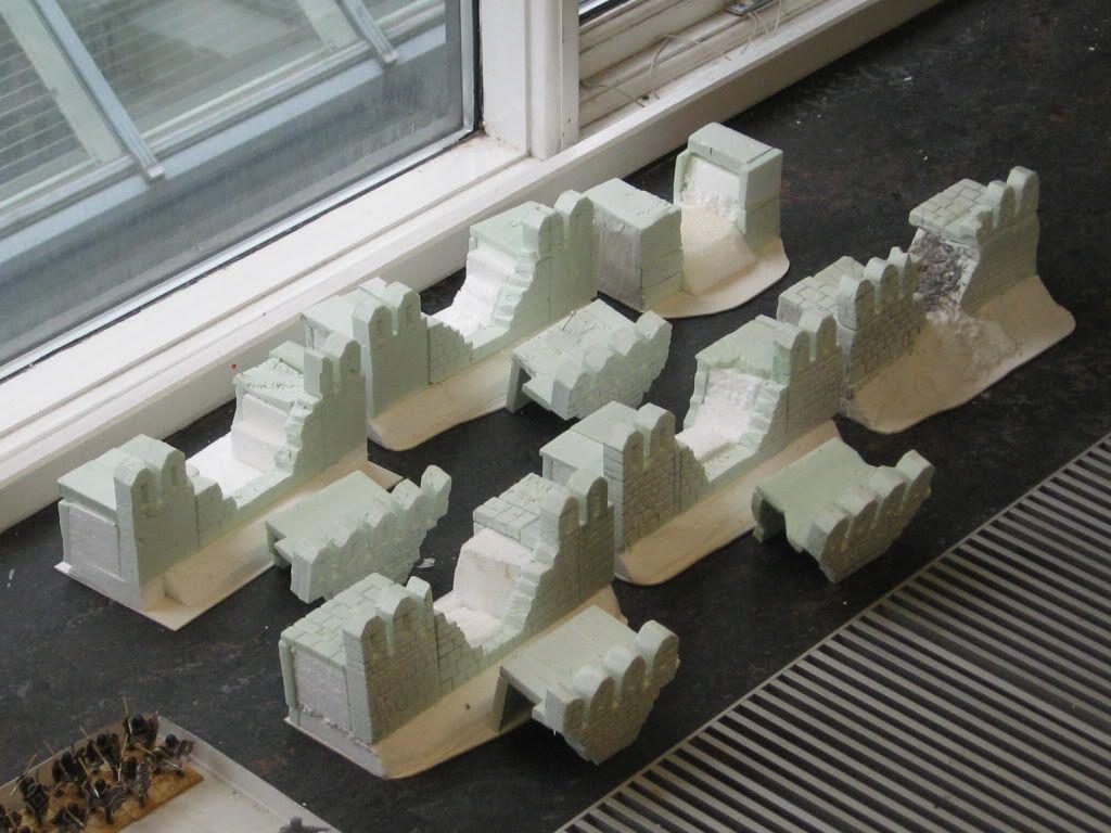 Following on from the fortified bridgehead at Osgiliath, the latest large scenery project nears completion... The Rammas Echor, the wall circuit that enclosed the Pelennor Fields that didn't make it into the Peter Jackson films. I've drawn my inspiration from Hadrians Wall. When complete I'll have 6 feet of continuous rampart, a couple of breached sections, three towers/bastions of varying designs, the main gatehouse and causeway approaches and of course the lighthouse (for the Harlond - the main harbour for Minas Tirith)