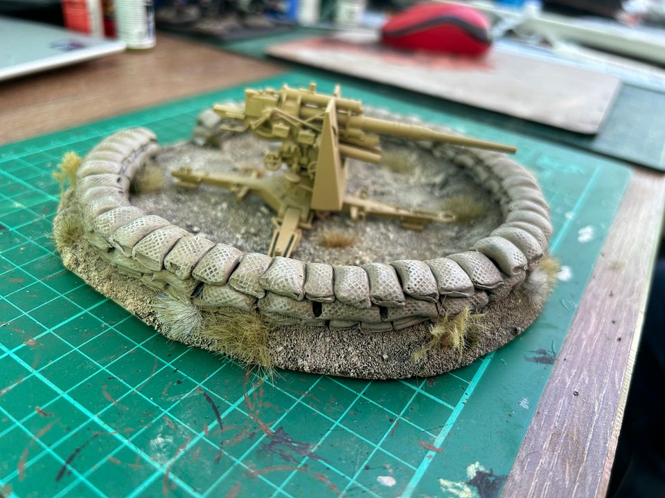 I thought a sandbag gun emplacement for some anti aircraft protection was in order. Thinking I’d start big, I decided to do one for the 88 first…..me thinks I will just do smaller 20cm emplacements from now on! The sand bags drove me to distraction!!!