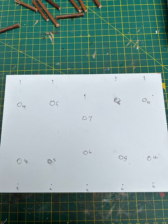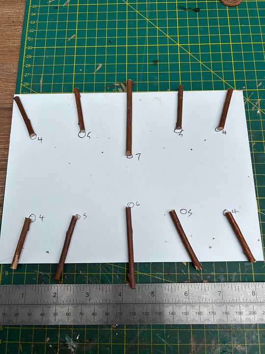 Now…without the use of rulers…ie doing it all by eye…..cut the sheet in half.  Cut a number of poles…..4 at 4cm, 4 at 5cm, 1 at 6 cm and 1 at 7cm.  Mark out like this.