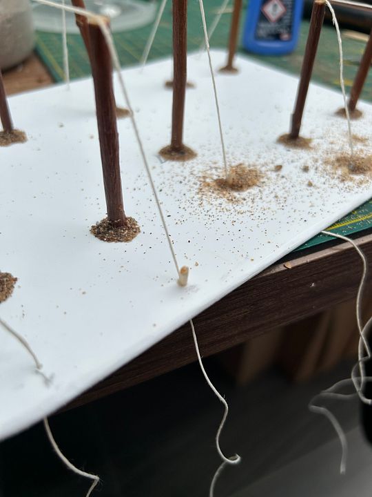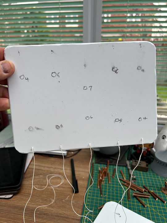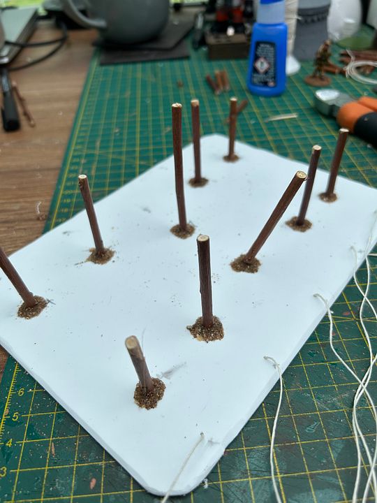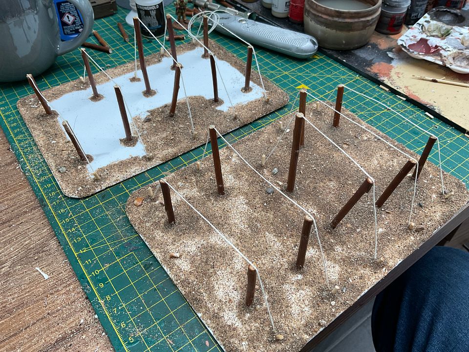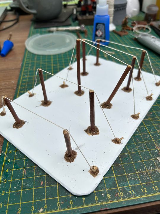 Now, put blobs of glue on tops of poles and lay thread over, threading down though opposite holes.  I then cut little pieces of cocktail stick to look like tent pegs….glue and sand them wher3 the strings disappear into the plasticard.