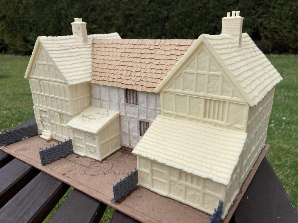As soon as I’ve tiled the other two roofs, I will cut out and fit the platforms for the chimneys (coming from OSHIRO Model Terrain) and then add the ridge tiles. After that it will be detailing and tidying.
