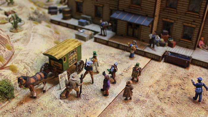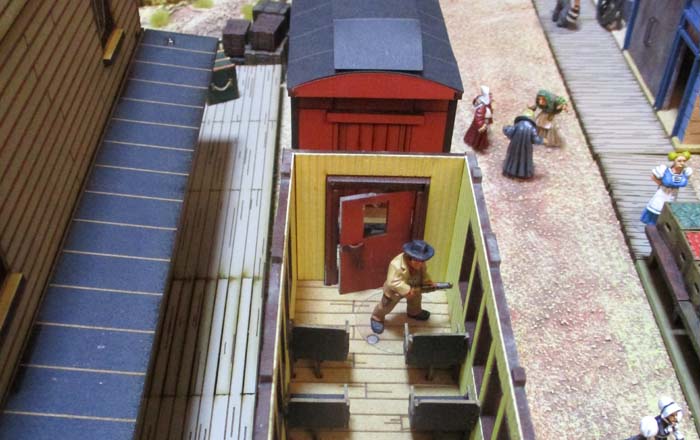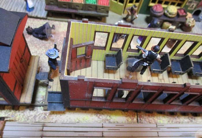 A better view of Snappers pretending to be brave, his two henchmen are still hiding in the Blacksmiths having traded shots with mad Ollie Standish, who’s still teetering on top of the carriage.