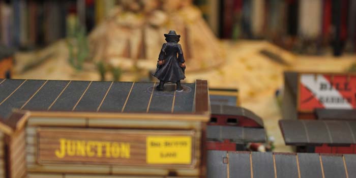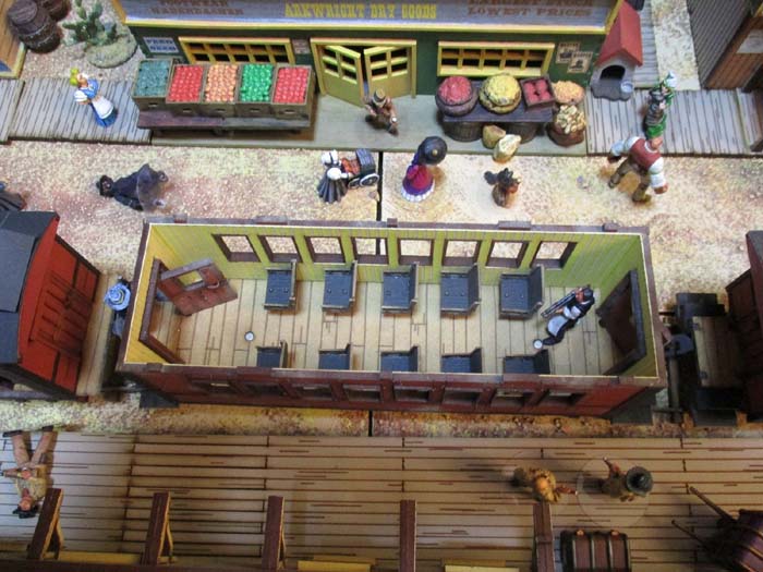 Of course he didn’t stay on the veranda but made the leap onto the carriage roof. I think he needed to roll 4 on 2D6 to achieve this famous feat but rolled 1+1. There was a loud gulping sound like a fish out of water, followed by a triumphant shout of “Bonanza” which allowed him to re-roll the dice in exchange for his Bonanza token.