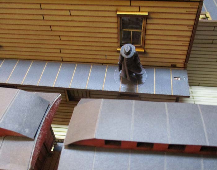 He took a bucket load of lead and adopted a prone position behind the skylight on the roof, from which position his figure kept rolling off and falling unceremoniously to the ground, but he was able to claim some cover from this manoeuvre.