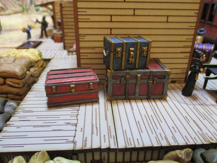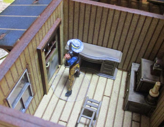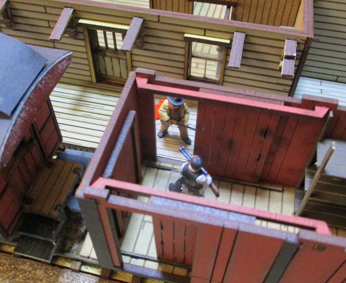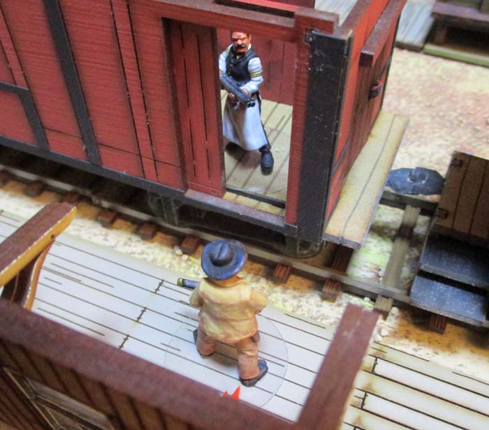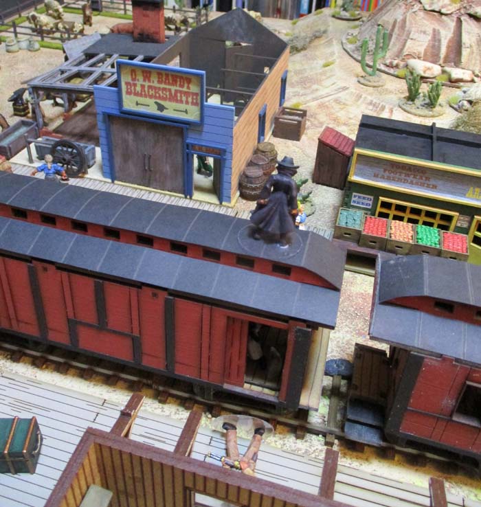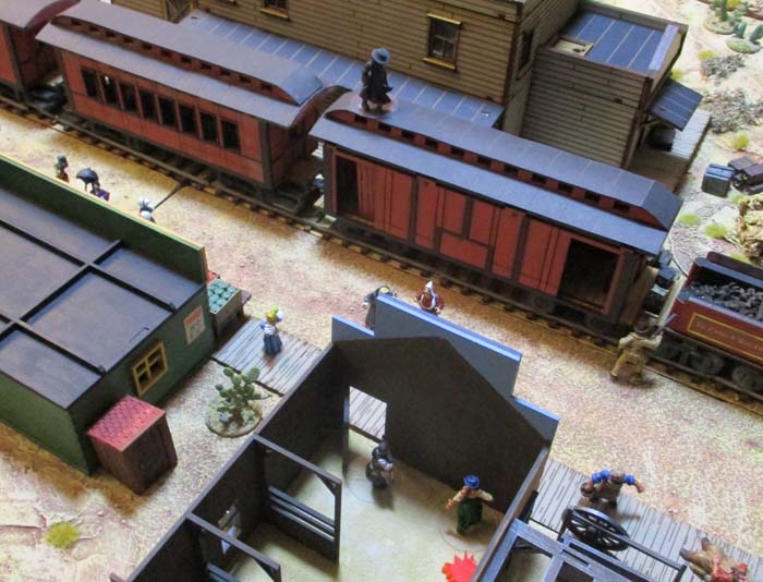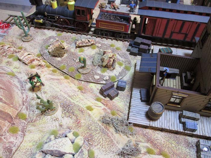 An overview from our side of the board, Standish is on the roof of the station, and hoping to get a better line of sight on any enemy approaching. The Posse of miscreants are in the boulder patch over to the left of the big butte and behind the blacksmiths, (the blue building).