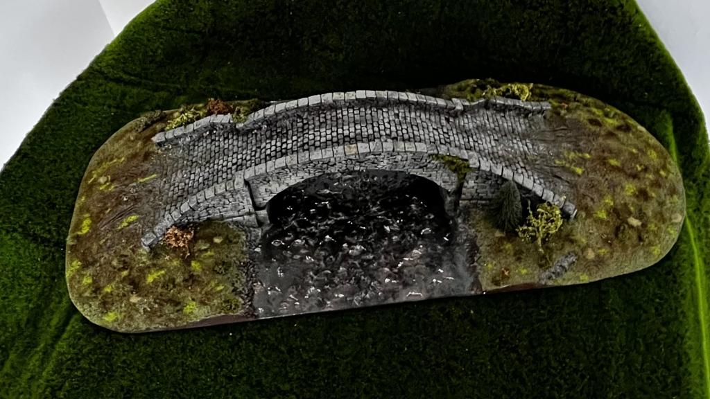 I raised it up from the original small bridge and put it on some foundations. The blasted thing now measures 75cm(29 and a half inches to old geezers like me!)The water is layers of gloss furniture varnish and clear and white silicon.