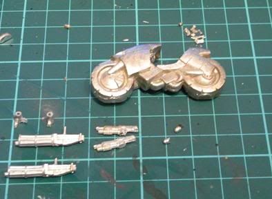 Then I took a look at the artwork again, and as well as the twin chainguns, the moto's also have a further pair of fairing mounted guns. So a quick dive in the bits box and a pair of  Hersey sci-fi guns did the trick. magazines, grip and handle removed and shortened to fit.
