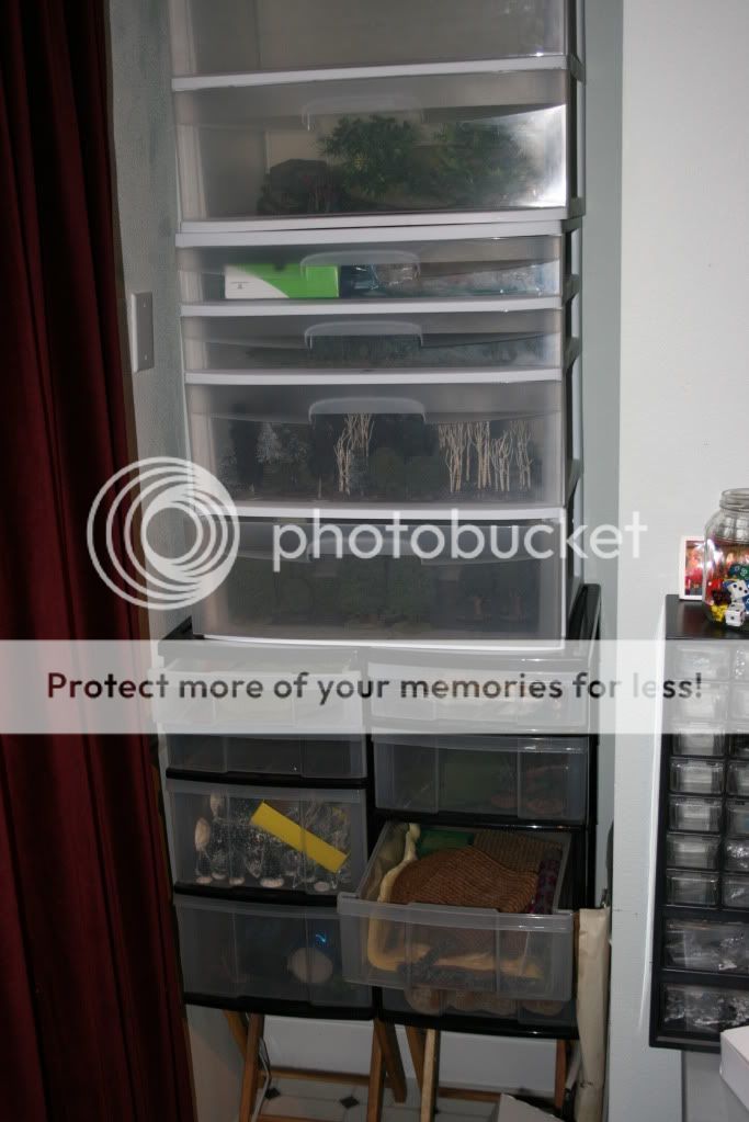 A few photos of my studio. I am currently working on 10mm terrain, and 10mm Gauls. Behind my painting table is a bookshelf which holds tubs of painted figs. In the small closet there is a tiny bookcase which I use to stack magazines, etc...and off in the corner is a stack of plastic drawers which holds misc terrain. Not pictured is another large wooden bookcase which holds the family library.