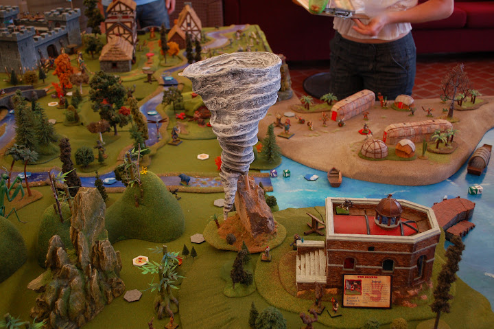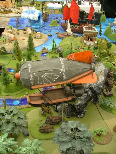 As to the game itself, I could go on for pages on the history of it. It started out as an advanced version of Tom Wham's Search for the Emperor's Treasure...but that was many years ago. The way it works now is that each year we examine our succession crisis (the Pygmy Chieftain is always perilously close to dying) and add a new theme to how the Pygmy heroes must go about proving themselves worthy of the Pygmy throne. The first year it was an RPG run for friends and the goal was to bring back something useful. We built all of our locations, played for 14 hours and had a blast. The Pygmies returned to their village on an airship. The one pictured below is the current version of that ship.