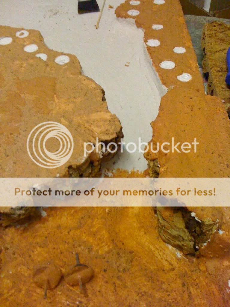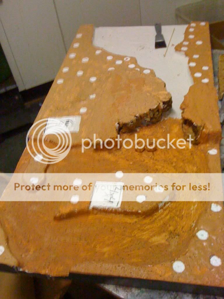 The brown painted part was originally the size of the hill/cliff that I wanted near the water to break up the board a bit. It turned out to be tiny, so I decided that big is great, so I did it 4 times larger in the end.