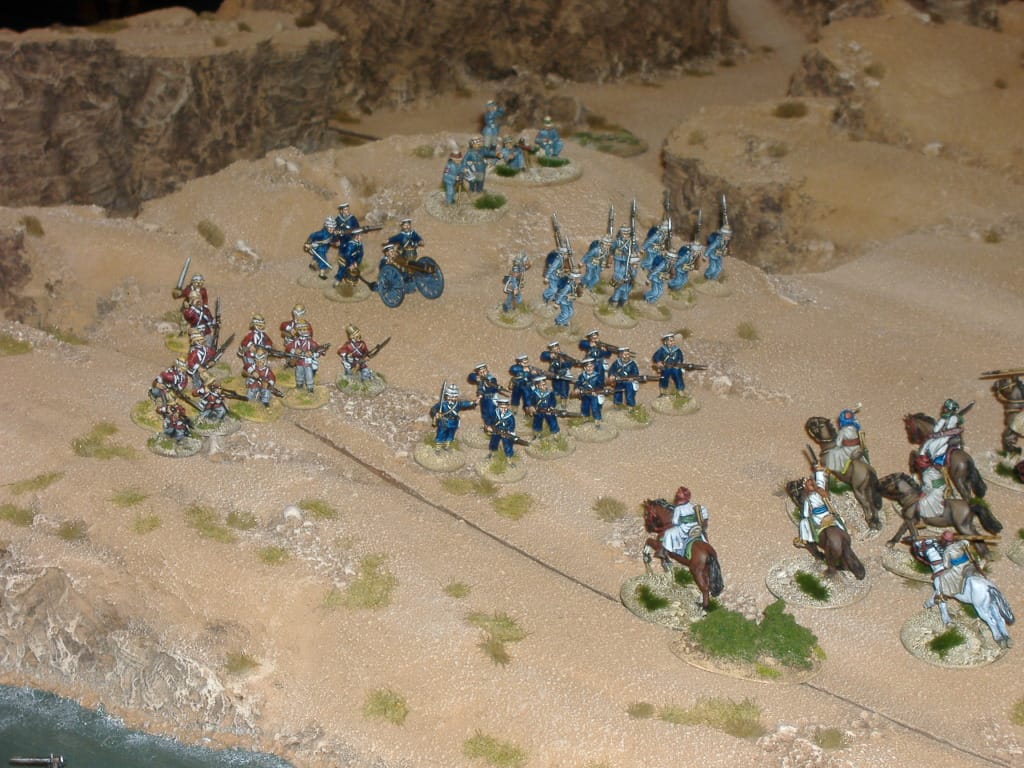The picture shows the charging cavalry. The game was a bit different. The Mahdists sent the infantry into the attack first, the cavalry was trying to outflank the British while the rifle unit was sneaking up the river bank.