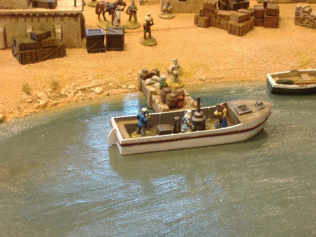 You can see the besieged city. The Mahdist charge the walls and are driven back. Gordon stands on the city roof in the center beside the flag. Life goes on at the harbour. Slaves are driven along the piers and some civilians try to escape with small steam boats.